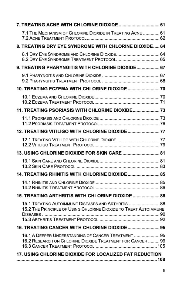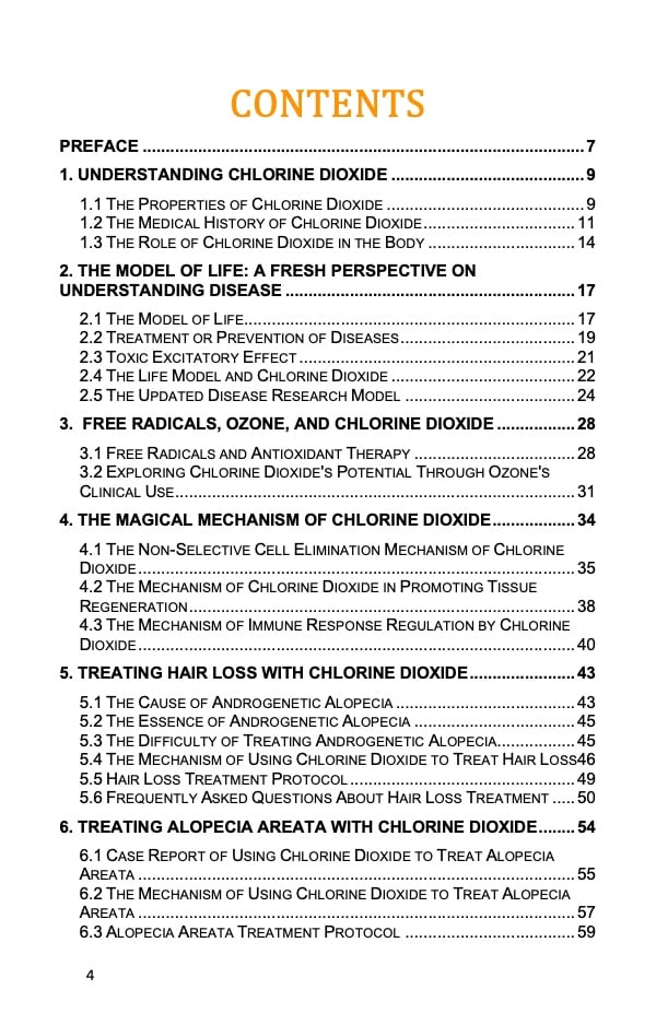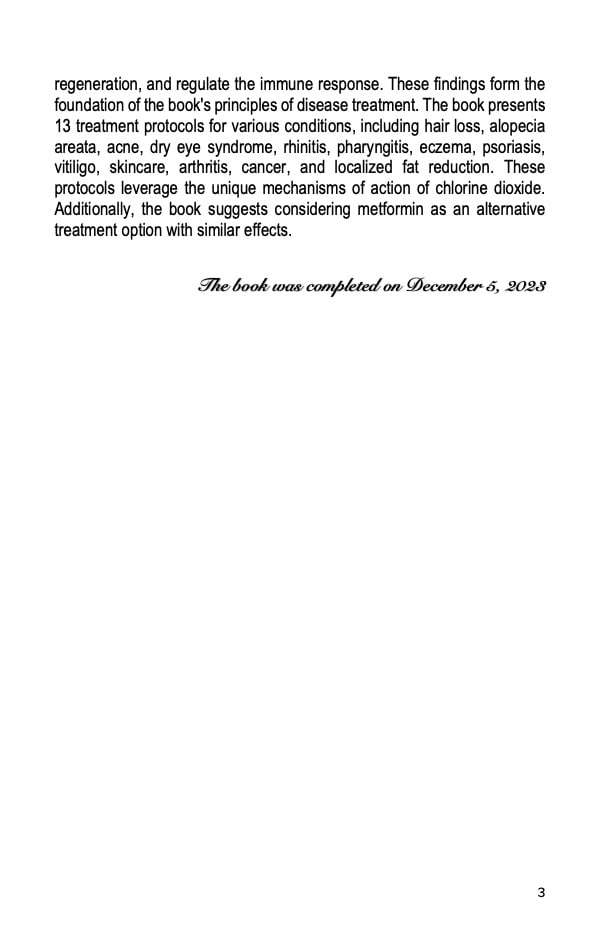 Through extensive self-experimentation, the author discovers chlorine dioxide’s remarkable ability to eliminate abnormal cells, promote tissue regeneration, and regulate the immune response. These findings form the foundation of the book’s principles of disease treatment. The book presents 13 treatment protocols for various conditions, including hair loss, alopecia areata, acne, dry eye syndrome, rhinitis, pharyngitis, eczema, psoriasis, vitiligo, skincare, arthritis, cancer, and localized fat reduction. These protocols leverage the unique mechanisms of action of chlorine dioxide.