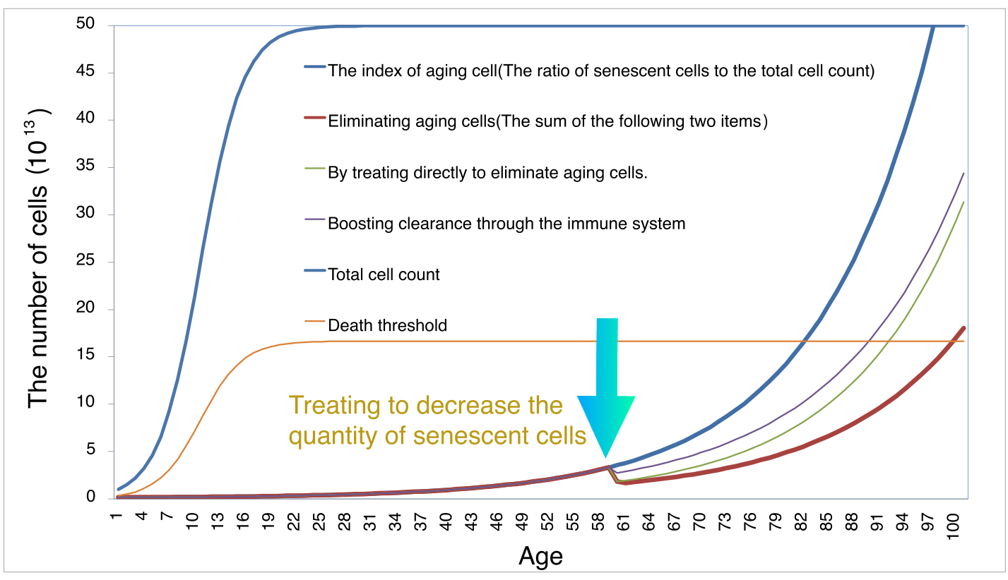 We can create a model of life: the human body has approximately 50×1012 cells. When the proportion of dysfunctional aging cells (senescent cells) reaches a certain level, the person’s systemic functions will fail, leading to death. In this model, a local excess of dysfunctional cells beyond a threshold equates to the onset of a disease. The body’s natural functions, especially the immune system, work to slow down or reduce the accumulation of aging cells